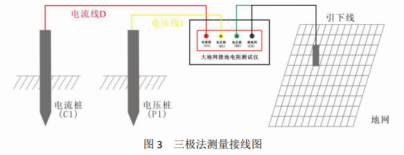 四極法測量時,從地網的地樁上引出二根連接線分別接到儀器的電壓極P2、接地網 C2 兩接線柱,然后按測量操作步驟進行測試。四極法測量時儀器會自動消除接線誤差。